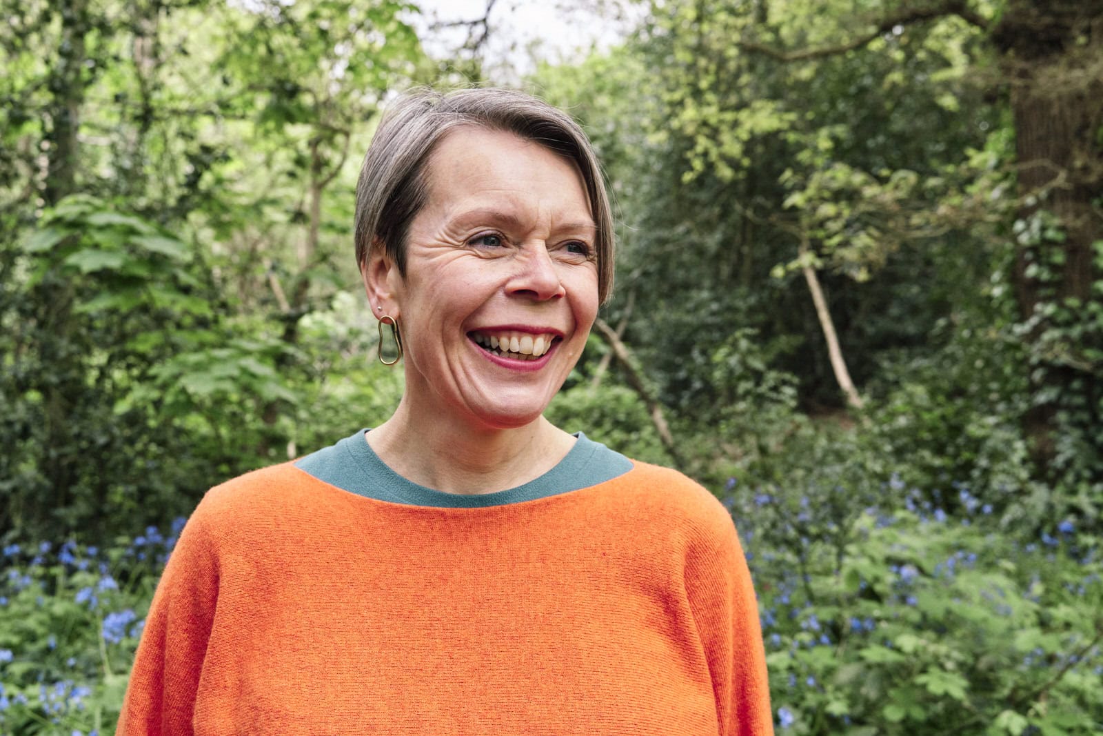 Woman wearing an orange sweater which contrast beautifully with the green background in this professional headshot.